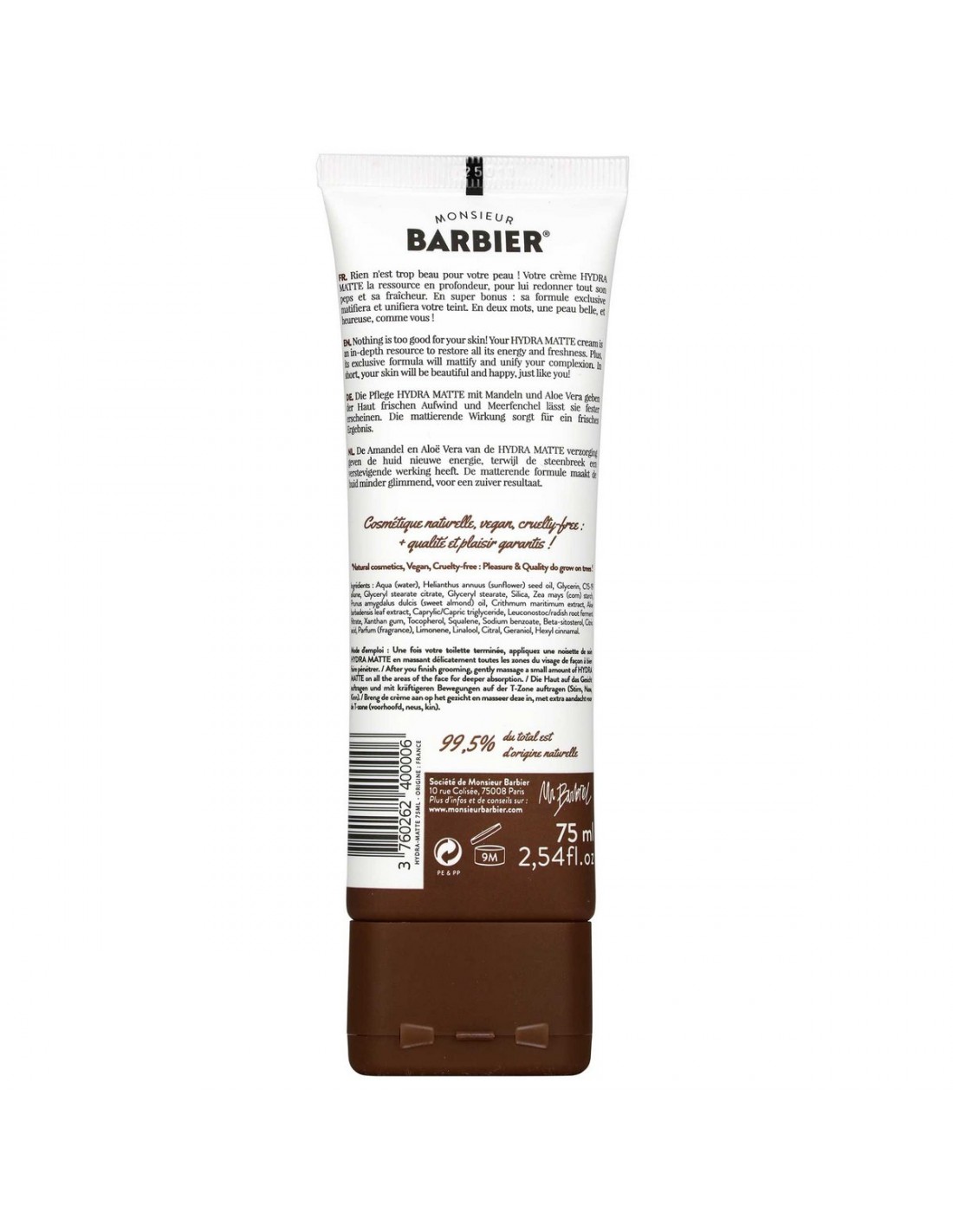 La Crema Viso Monsieur Barbier opacizza e uniforma l'incarnato in un solo gesto! Arricchito con olio di mandorle dolci, aloe vera e samphire, ripristina la barriera cutanea, idrata in profondità e rassoda la pelle riducendo i segni di affaticamento e lucentezza. Non unge né appiccicoso, la sua consistenza fluida penetra rapidamente e dona una sensazione di freschezza.